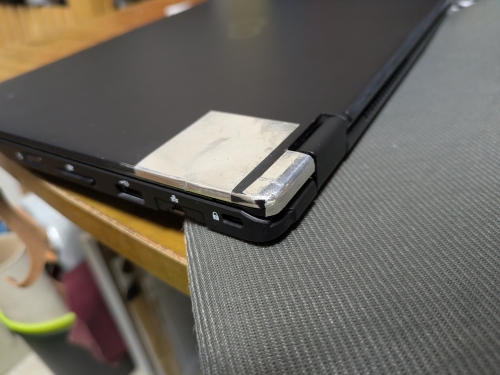 開閉する度に爪が外れてしまうので、角の爪部分をアルミテープで補修して外れないようにした