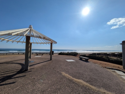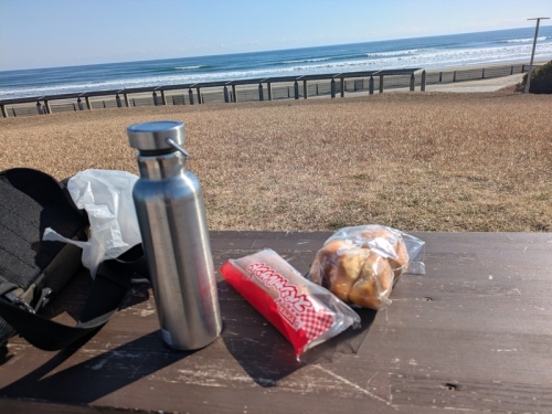 ベンチに座り海を眺めながらの昼食